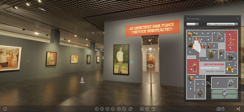 3D-туры по выставочным пространствам становятся стандартом для крупных культурных комплексов. Так, в августе 2025 года на сайте ВДНХ появились виртуальные туры по пяти площадкам: центру «Космонавтика и авиация», музею славянской письменности «Слово», Музею героизма и другим локациям. Проект, подготовленный к 86-летию ВДНХ, позволяет москвичам и туристам в онлайн-формате знакомиться с экспозициями. Один из туров посвящён выставке Третьяковской галереи, где можно увидеть модель монументальной композиции Веры Мухиной «Рабочий и колхозница» и горельеф «Знаменосцу мира, советскому народу — слава!», считавшийся утраченным, но найденный во время реставрации.